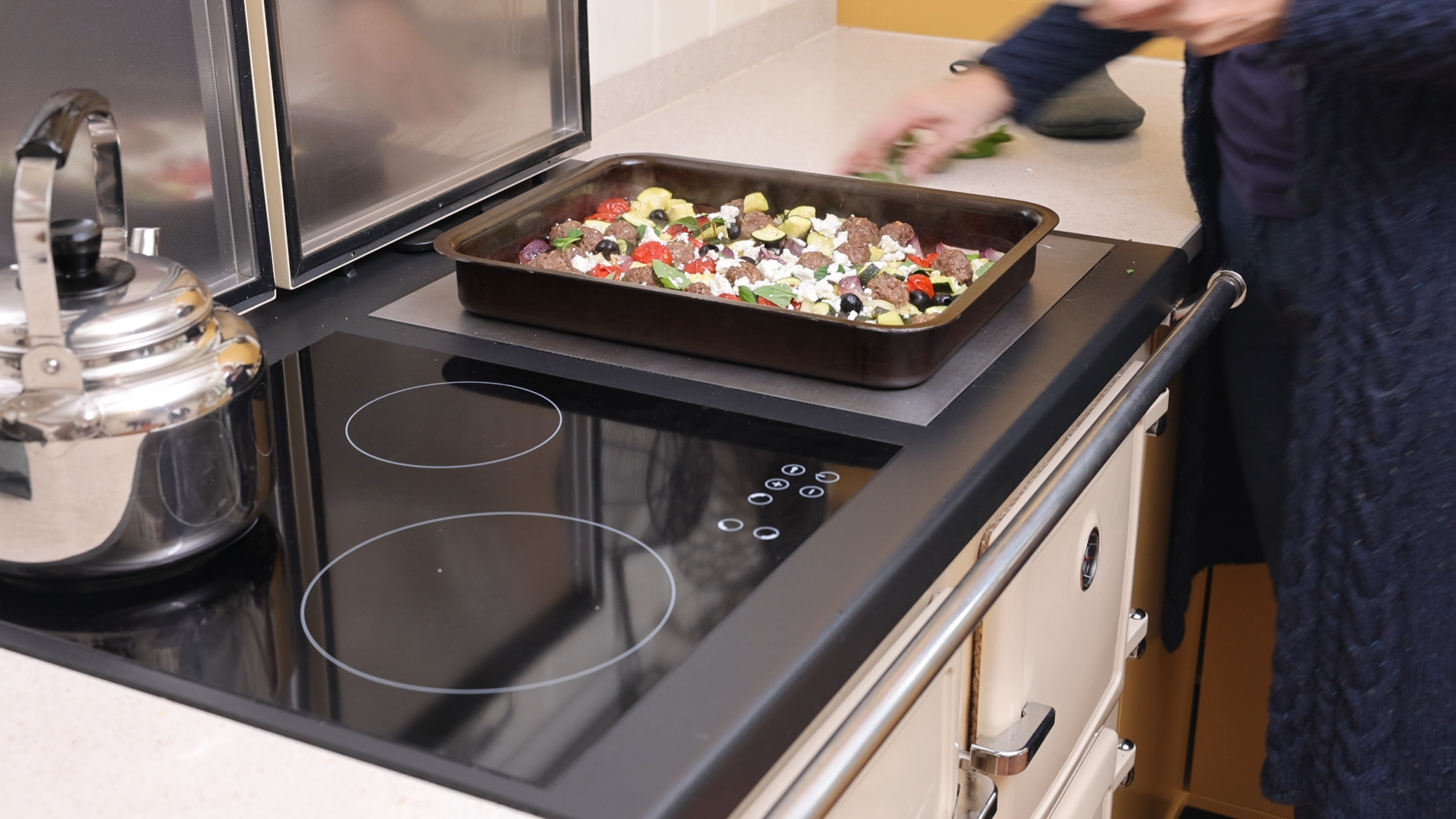 Bereid de braadslede Bekleed de grote Esse braadslede met Bake-O-Glide bakmat Verdeel de gehaktballetjes in de slede Voeg de courgetteblokjes, kerstomaatjes, uienparten en olijven toe