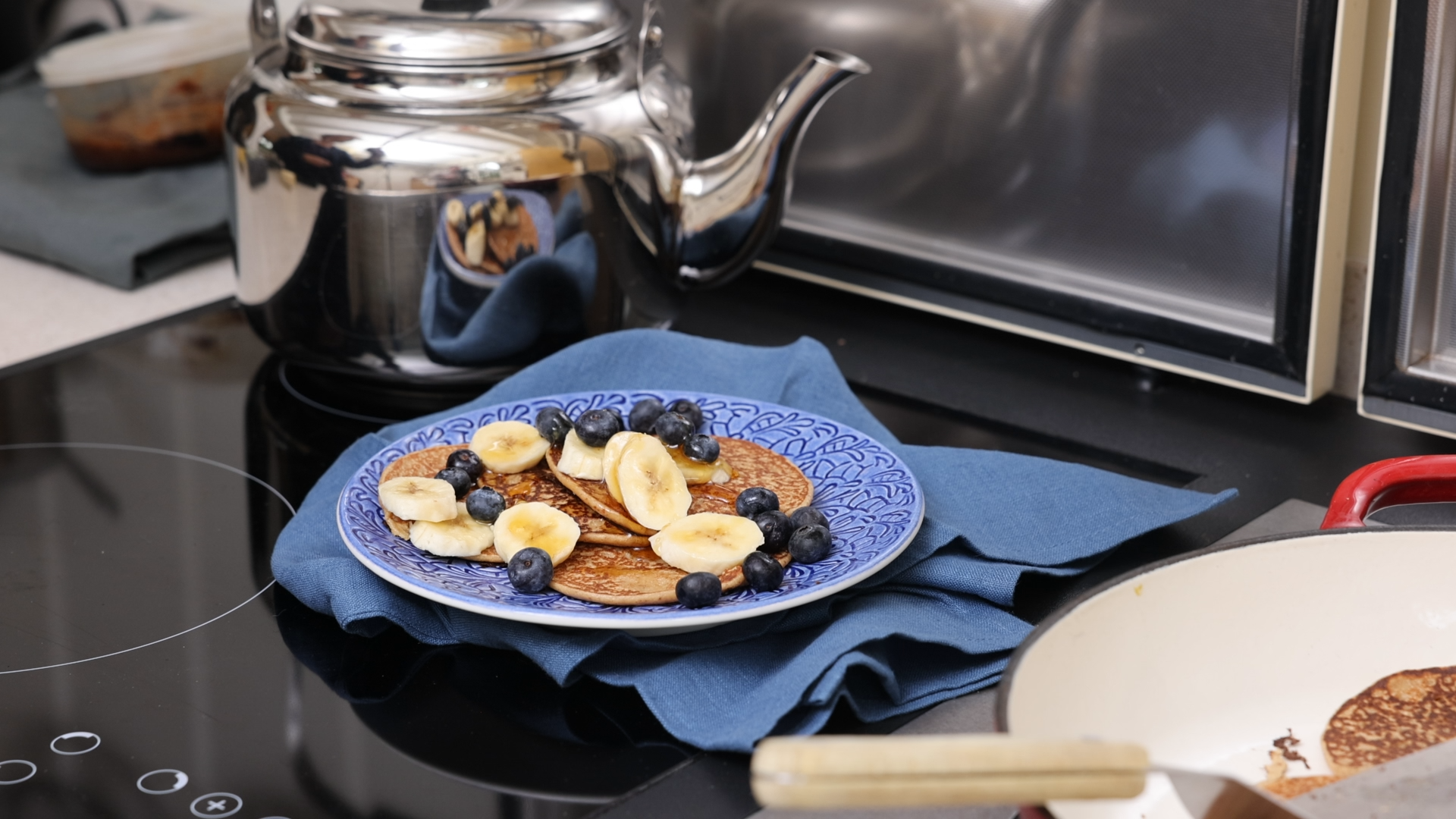 Serveren Stapel de warme pannenkoekjes op borden en garneer met ahornsiroop, verse blauwe bessen en banaanplakjes.